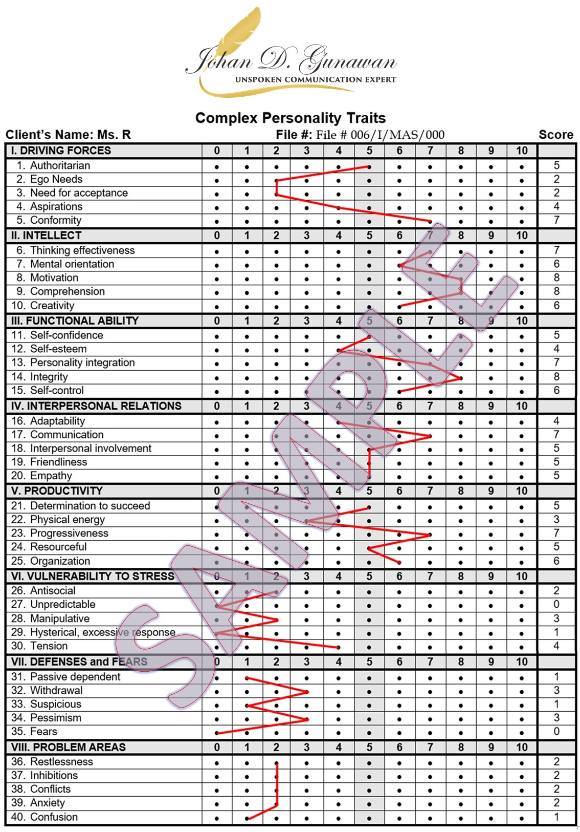 Dengan memetakan bagian kepribadian ini, Anda akan memiliki pemahaman yang jauh lebih mendalam tentang diri Anda. Sehingga langkah yang Anda pilih selanjutnya dalam hidup akan jauh lebih EFEKTIF dan tepat, serta terhindar dari berbagai konflik. Complex Behaviour Analysis membahas lebih dari 500 tanda kepribadian yang kami kelompokkan dalam 40 aspek. Tetapi tenang saja, karena analisa tersebut kami rangkum secara seksama dalam suatu laporan yang mudah dimengerti.